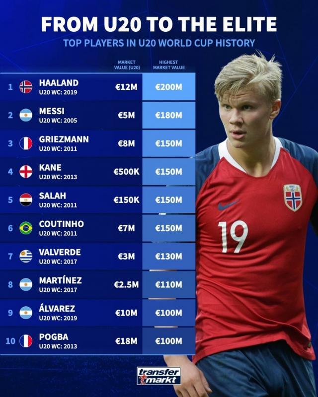 德转统计U20世界杯球星身价变化:梅西500万1.8亿,哈兰德最高