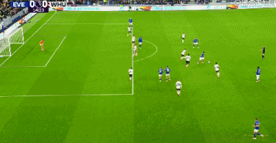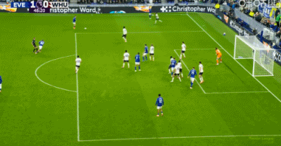 第65分钟,鲍恩禁区右路兜射远角破门,埃弗顿1-1西汉姆联