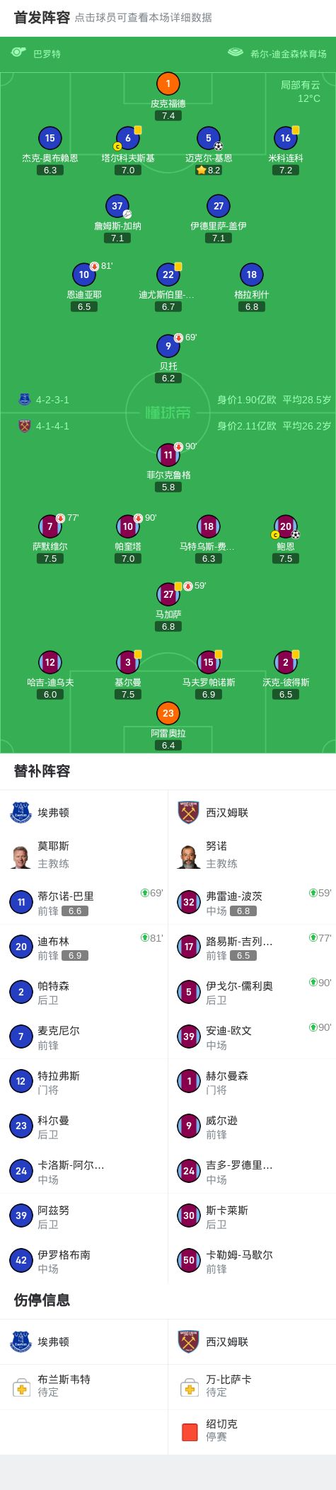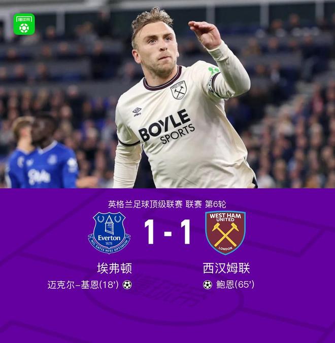 北京时间9月30日英格兰足球顶级联赛联赛第6轮,埃弗顿主场对阵西汉姆联。埃弗顿迈克尔-基恩破门,西汉姆联鲍恩破门扳平比分。最终比分埃弗顿1-1西汉姆联。关键事件第18分钟,迈克