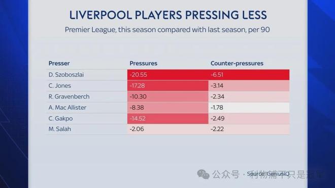 除了三大新援伊萨克、维尔茨和埃基蒂克这方面需要磨合提升,即便上赛季利物浦夺冠阵容中的6名中前场球员,在高位逼抢和就地反抢这两项数据也比上赛季下降。(索博斯洛伊数据的下降,与他在一些比赛中客串右后卫有关。)