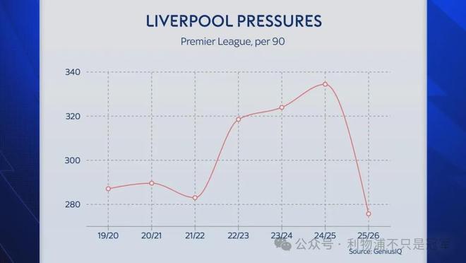 上赛季利物浦的逼抢次数超过此前5个赛季,但本赛季却急剧下滑到7个赛季以来的最低值。