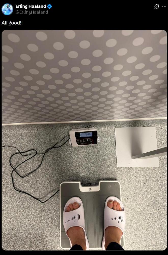 作为回应,曼城前锋哈兰德在社交媒体上发布了一张自己站在体重秤上的照片,并配文“一切都很好!!”