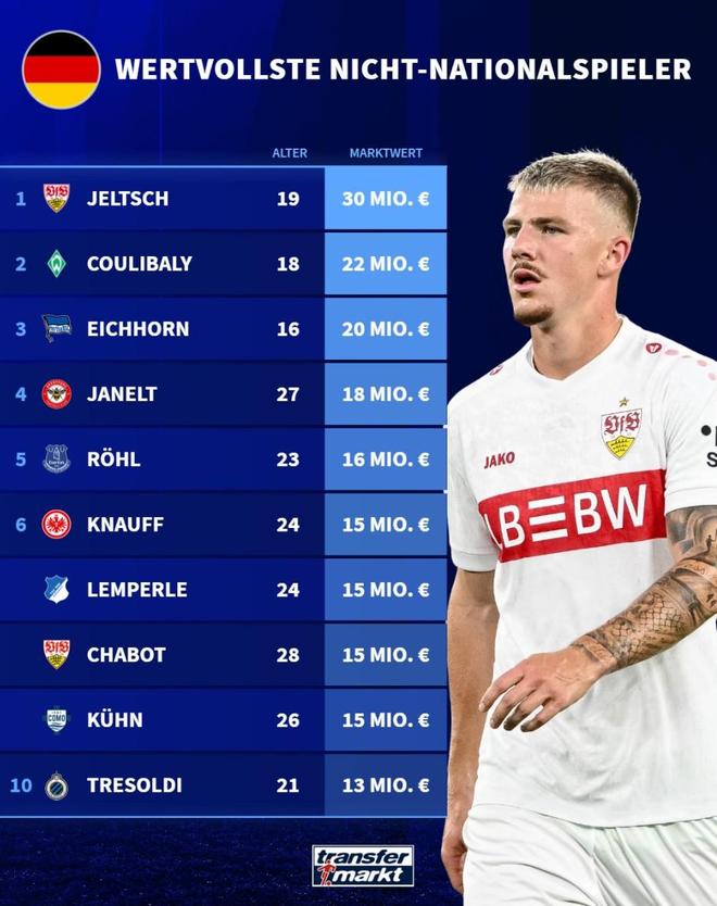 在德转公布的身价榜单中,斯图加特的19岁球员耶尔奇以3000万欧元居首;不莱梅的库利巴利以2200万欧元位居第二;来自柏林赫塔的16岁小将艾希霍恩以2000万欧元排名第三。