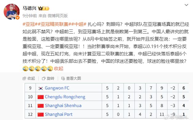 “从8月中旬抽签之前,就开始并且反复在说:一定要重视亚冠、一定要重视亚冠!!当时新赛季尚未开始,泰超以0.191个技术积分反超中超,现在五轮打完,尚未计算亚冠二级联赛的比赛,中超已经快落后泰超6个技术积分了!中超俱乐部出去不要脸,中国的球迷还要脸呢,球迷的脸往哪里放?”