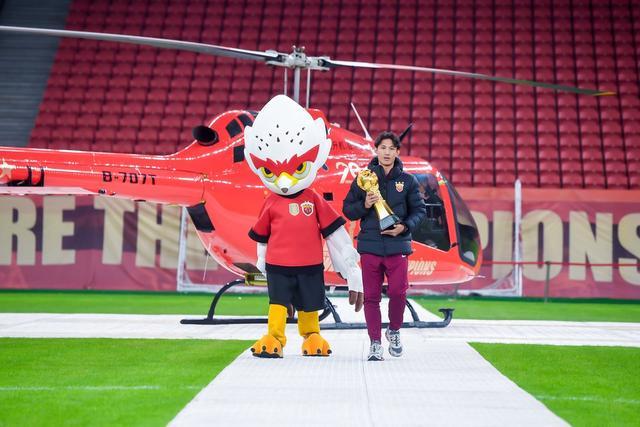 总结会在悠扬的交响乐曲中拉开帷幕,俱乐部吉祥物伊戈率先登场暖场,海港一线队全体教练员、球员与工作人员在全场热烈欢呼声中集体亮相。激动人心的夺冠视频播放完毕后,载有队长王燊超与火神杯的临港捷运纪念版直升机从川沙飞抵球场,这一“低空+足球”的创新环节,不仅展现了冠军荣耀,更成为俱乐部探索体旅融合新范式的生动实践。随后,王燊超与上海海港足球俱乐部党总支书记、总经理沙良昌共同将新赛季冠军奖杯安放于奖杯柱顶,与三座往届火神杯组成“冠军奖杯矩阵”,全场掌声与欢呼声经久不息。